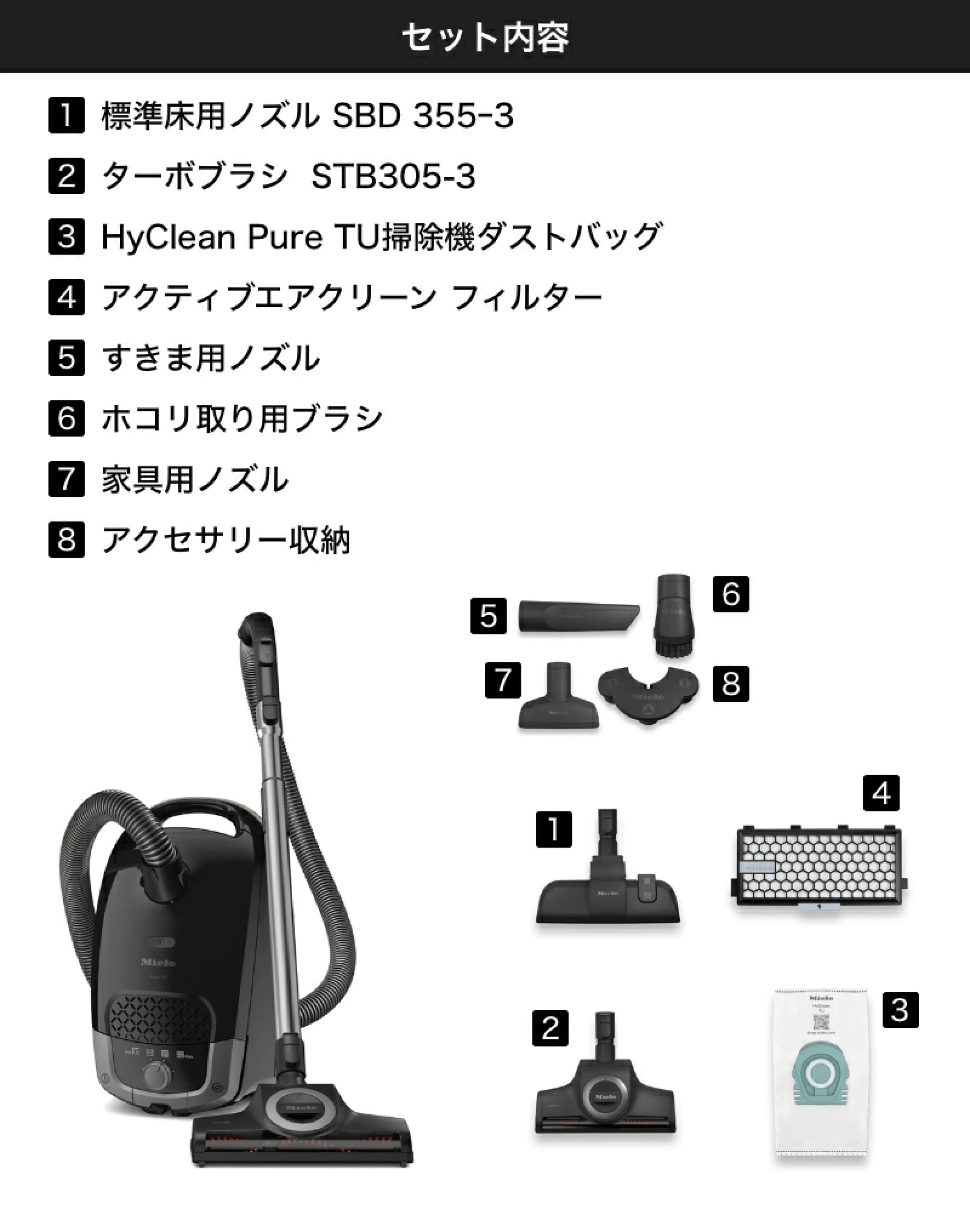 ターボブラシ(STB305-3) / 標準床用ノズル(SBD355-3) / 付属ノズル (すきま用ノズル・家具用ノズル・ホコリ取用ブラシ) / 排気フィルター (アクティブエアクリーンフィルター1枚装着済) / ダストバッグ (HyClean Pure TU 1枚装着済)